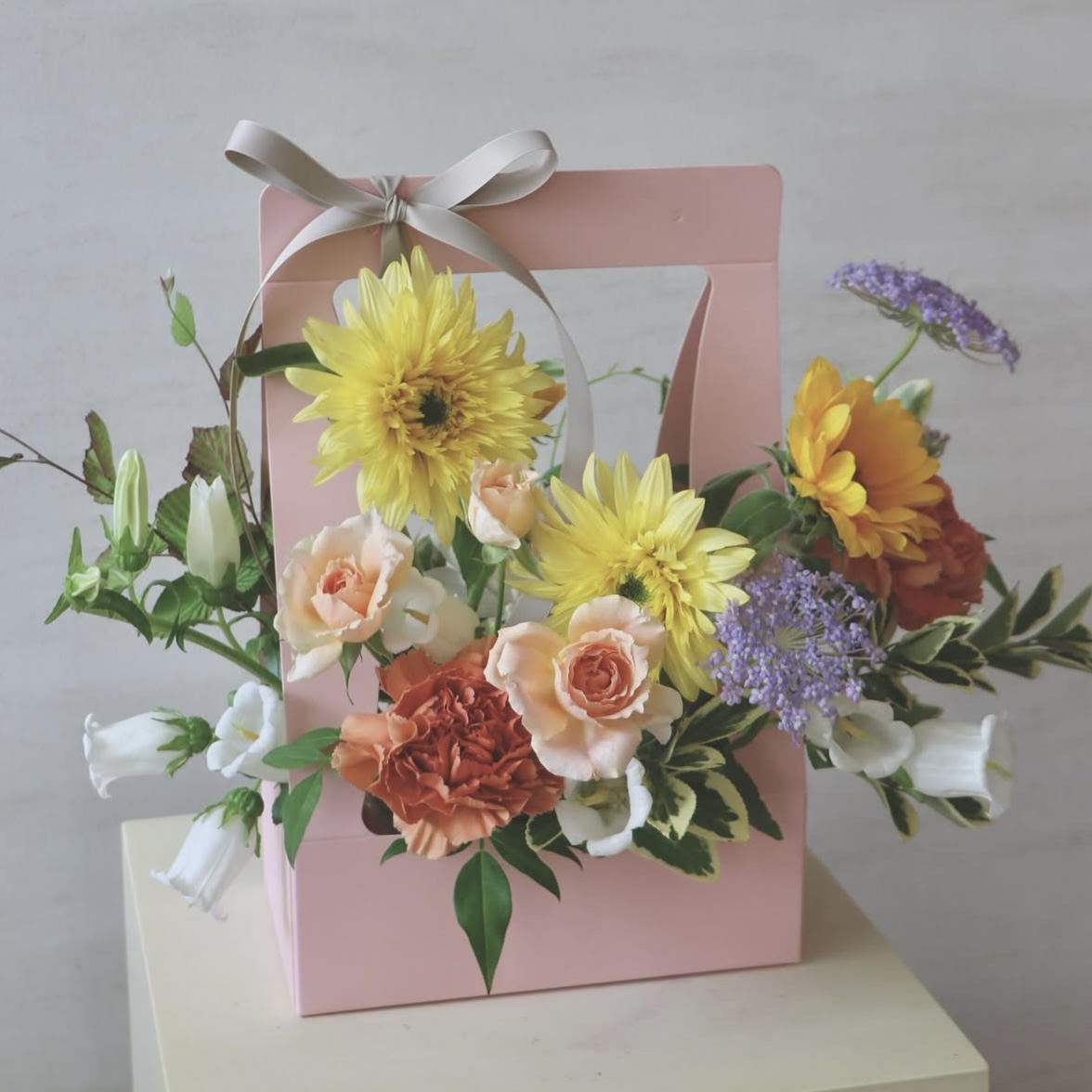 持ち手が付いたペーパーバッグのアレンジメントを制作します。